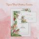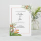 A tropical themed wedding invitation with colorful tropical greenery and florals.