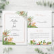 A tropical themed wedding RSVP with colorful foliage and florals