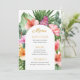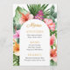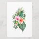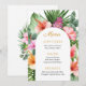 A beautifully lush tropical party menu design with colorful watercolor floral elements that include hibiscus blooms, ginger flowers and a variety of tropical foliage surrounding a stylish arched frame. The looks is vibrant and alive and sets the tone for your celebration in aloha style. Personalize the easy-to-use text template with your menu items. If you need to move the text around, add or remove lines of text, select "click to customer further", which will open up the design template to make additional changes. Whether you are having an outdoor barbecue or a poolside luau, this menu is a beautiful choice.