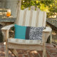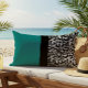 This trendy outdoor lumbar pillow features large rectangular colour blocks in teal green and a silver and black leopard print, divided by a narrower black colour block in the centre.