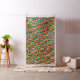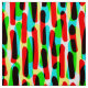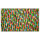 A design made up of three different layers of hand drawn dashed strokes in three different colours which interact with each other creating additional colours. This pattern can be made larger or smaller.