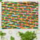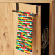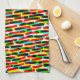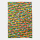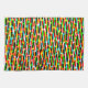 A design made up of three different layers of hand drawn dashed strokes in three different colours which interact with each other creating additional colours. This pattern can be made larger or smaller.