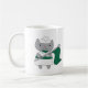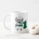 Do you like cute mugs? This mug features a cute grey kitty cat wearing a green and white marching band uniform while holding a green flag.