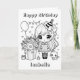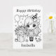 Cute little birthday girl with her balloons, kitten and gifts. Black and white simple and easy colouring page on the front of the card. Add the little girl's name in the personalise area.