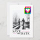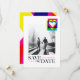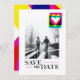 A trendy design-led save the date photo card featuring a bright pop of colour in CMYK print styling.
