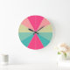 A clock face divided into 12 x 30 degree segments each divided with a white line and in a palette of 5 colours with adjoining segments at the top and bottom using the same colour creating symmetry and adding emphasis to the hours and half hour, looking rather like a pie chart.