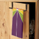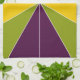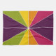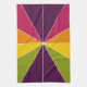 A design with 12 x 30 degree segments each divided with a white line and in a palette of 5 colours with adjoining segments at the top and bottom using the same colour creating symmetry.