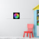 Spoke-wheel in a spiralling rainbow colour pattern on a beige background.