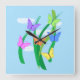 Clock with my design of six butterflies of purple, green, blue, orange, pink and yellow on blades of grass with puffy white clouds.