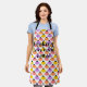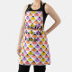 This adult apron has a design of coneflowers scattered about the design in yellow, orange, pink, and purple on a field of white.