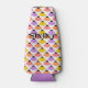This bottle cooler has a design of coneflowers scattered about the design in yellow, orange, pink, and purple on a field of white.