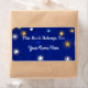 A custom bookplate with elegant vintage art of glowing stars against a blue sky etching.