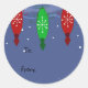 A great design featuring red and green hanging baubles with a snowflake design. A blue background with falling snow.