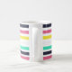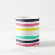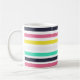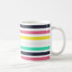 A colourful can cooler with a striped pattern. The white mug has horizontal black, pink, yellow, and turquoise stripes. It's designed to fit a standard beverage can.