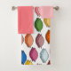 This towel set has a light pink washcloth, a darker pink hand towel, and a bath towel with a mid-century modern design of sets of three leaves in fading shades of retro colours.