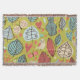Whimsical coloured leaves in coral, blue, and cream on a pretty green background with lots of raindrops, hearts, butterflies, and a bird!