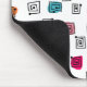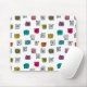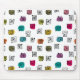 This mouse pad has a mid-century modern design of scattered mazes, some with coloured blobs under them.