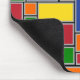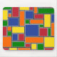 This mouse pad has a Bauhaus design of rectangles formed with grey lines and filled with red, yellow, orange, blue, and green on a field of black.