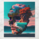 A skull head has been completely coloured in an abstract style to bring you into the world of creativity and surreal design, in the style of photo-realistic landscapes, tropical landscapes, futuristic realism, pixelated realism, light crimson and sky-blue, surrealistic dreamscapes