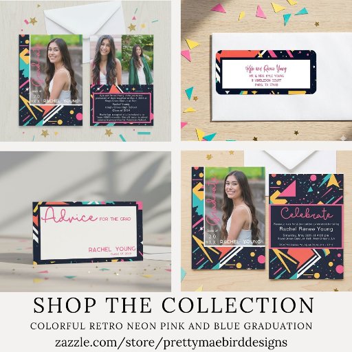 Transport yourself to the dynamic era of the '80s with our vibrant graduation photo magnet! Against a backdrop of sleek navy blue, bursts of vivid pink, electric blue, and lime green form playful abstract shapes, echoing the spirited energy of the decade. Front and centre, a cherished graduation photo captures the essence of accomplishment and pride, while flipping to the back reveals two additional snapshots, symbolising the journey leading to this triumphant moment.