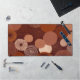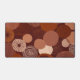 Abstract pattern composed of various circles in different shades of brown, ranging from light beige to dark chocolate. Each circle has a unique design, including lines, spirals, dots, and dashes, creating a visually engaging and textured composition. The background is a dark brown colour, which contrasts with the lighter and more vibrant hues of the circles. The overall effect is a rich, warm,