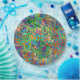 A smattering of tiny squares in different sizes are sprinkled over a watercolor-textured background. I created this abstract art piece digitally. Features greens, yellows, orange, hot pink, blue and purple.