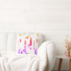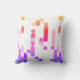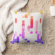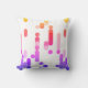 This modern pillow features abstract pattern with geometric shapes in vibrant yellow, red, pink, purple and blue gradient on white background.
