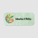 This name tag is a mottled light green with a colourful abstract lizard in bold colours of yellow, green, orange, and blue holding a green leave on a branch. Customise your text with the template.