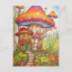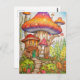 This creative postcard features an illustration of a dwelling deep in the forest made of massive blooming mushrooms.