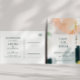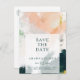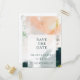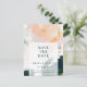 This colourful abstract save the date postcard is perfect for your unique modern boho wedding. Hand-painted with textured brush marks of dark emerald green, peach, and mustard, all overlayed with a minimalist transparent square, it's sure to give your occasion a simple yet rustic bohemian feel.