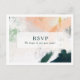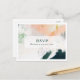 This colourful abstract song request RSVP postcard is perfect for your unique modern boho wedding. Hand-painted with textured brush marks of dark emerald green, peach, and mustard, all overlayed with a minimalist transparent square, it's sure to give your occasion a simple yet rustic bohemian feel.