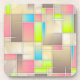 An abstract illustration with large and small squares and rectangles with intersecting lines. This creative design has contrasting pastels and brights in the colours of cream, rose pink, lime green, light brown and bright blue.