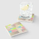 An abstract illustration on a stone coaster with varying squares and rectangles with intersecting lines. This geometric pattern has pastels and brights in the colours of cream, rose pink, lime green, light brown and bright blue.