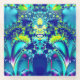 This unique abstract coaster features symmetrical fractal art in vibrant colours: blue, cyan, green, and purple.