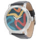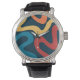 Abstract contemporary art design with colourful (blue, red, yellow, orange) waves decoration on navy blue background
