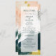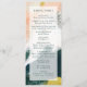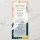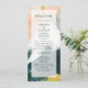 This colourful abstract wedding program is perfect for your unique modern boho wedding. Hand-painted with textured brush marks of dark emerald green, peach, and mustard, all overlayed with a minimalist transparent square, it's sure to give your occasion a simple yet rustic bohemian feel.