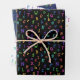 Back to school wrapping paper sheets in colourful patterns of letters, big and small. One with a black background, one with a white background, and one with a navy blue background.