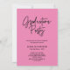 These on-trend, modern graduation party invitations for the class of 2023 feature a photo of the graduate, with colourful bold, bright pink trendy handwritten script typography on a dark, black background. Grad party details go on the back.