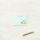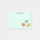 Personalised post-it notes with a trio of cute and whimsical hand-drawn birds. 2 of the birds are standing together with some tiny green pine trees in between their feet. Another blue bird is flying up in the air between them. Mint green background.
