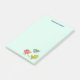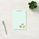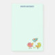 Personalised post-it notes with a trio of cute and whimsical hand-drawn birds. 2 of the birds are standing together with some tiny green pine trees in between their feet. Another blue bird is flying up in the air between them. Mint green background.