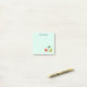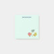 Personalised post-it notes with a trio of cute and whimsical hand-drawn birds. 2 of the birds are standing together with some tiny green pine trees in between their feet. Another blue bird is flying up in the air between them. Mint green background.