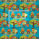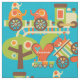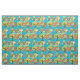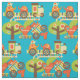 Colourful Animal Train fabric featuring a train theme for kids who love animals and trains, has a sky blue background with a locomotive and train cars with elephants, tigers, and giraffes, bright orange hearts, trees, and colourful train tracks!
