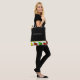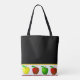 Fun teacher's tote bag done in black, with a white band, along the bottom, with yellow, green, and red apples. White text is ready to personalise for yourself or for your favourite teacher.