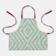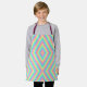 "Colourful apron with a vibrant geometric pattern of concentric diamonds in shades of blue, green, pink, and yellow. Displayed on a plain background and worn by a smiling person in a grey sweater."