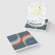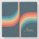 Retro style double arches geometrical pattern illustration with turquoise, blue, red and beige stripes decoration on dark blue background. Add your name/monogram or delete the text.