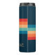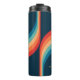 Retro style double arches geometrical pattern illustration with turquoise, blue, red and beige stripes decoration on dark blue background. Add your name/monogram or delete the text.