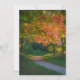 A photograph of a vibrant maple tree standing in a forest clearing. The tree’s leaves are transitioning from bright green to fiery shades of red, orange, and yellow, catching the golden light of the late afternoon sun. A gently winding path, covered with fallen leaves, leads into the background of the image, lined with blurred silhouettes of other trees. Soft sunlight filters through the canopy, creating dappled shadows on the forest floor.