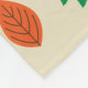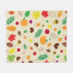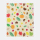 This fleece blanket features a colourful pattern with autumn leaves, berries, pumpkins, acorns, and chestnuts on a beige background.