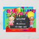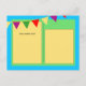 A cheerful postcard featuring happy children on a chalkboard background with coloured pencils. The back of this postcard has several template rectangular shapes. You can customise or delete them if you like.