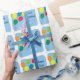 This cute boys birthday wrapping paper design features a graphic of a grouping of bold coloured balloons waving in the wind. The background is light blue which makes it perfect for a little boy's birthday.